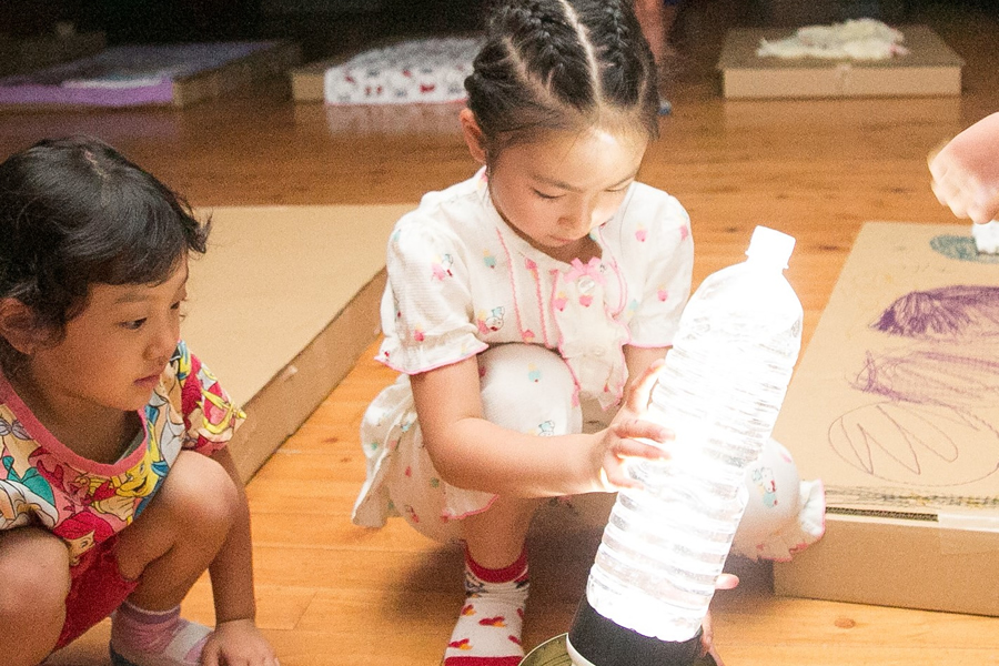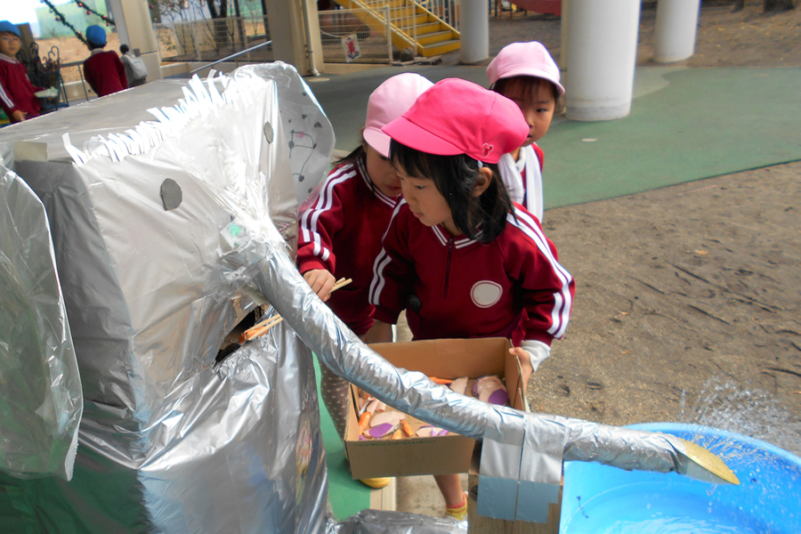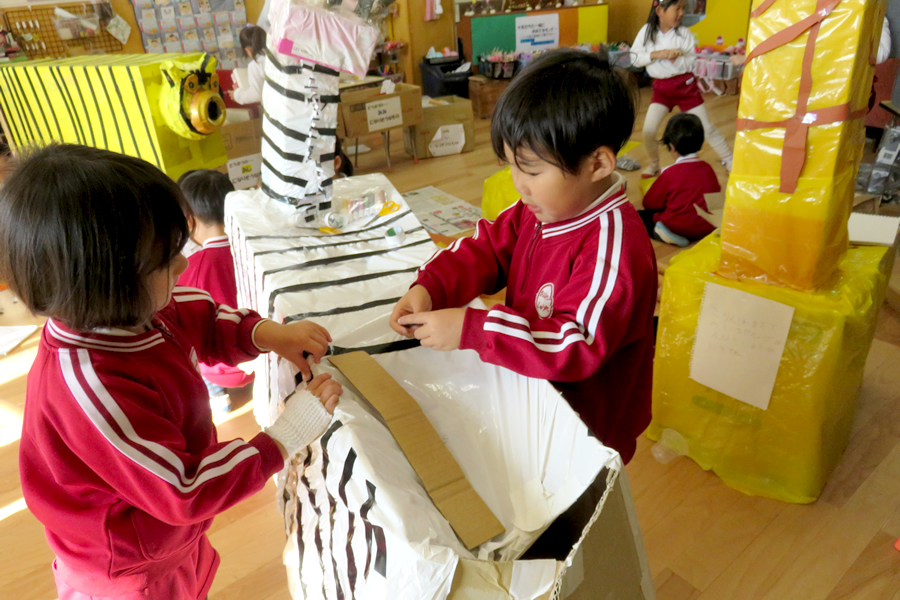 感動は子どもたちの制作に活かされて、うみたまごもサファリも自分たちで再現します。友だちと一緒に考え工夫する活動は協調性も育みます。