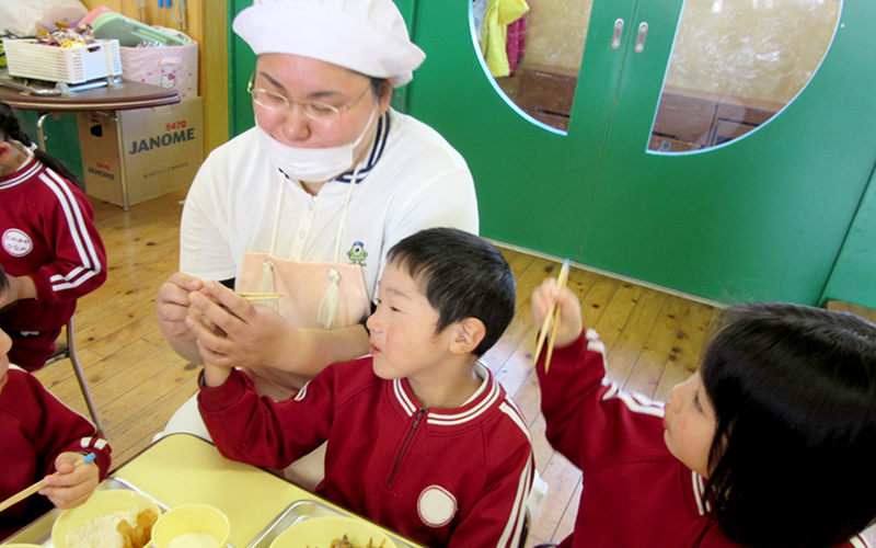 本園の給食は、下郷農協の有機農栽培による安心安全な食材を主に使って自園で調理しています。管理栄養士が季節感のある献立を立て、食事中は、園児ひとりひとりの様子を見ながら支え、みんなで楽しい時間となるように心がけています。