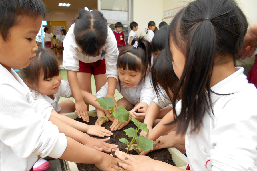 芋の成長を見るためみんなで掘り出すサツマイモの苗を年長さんが植えます。
